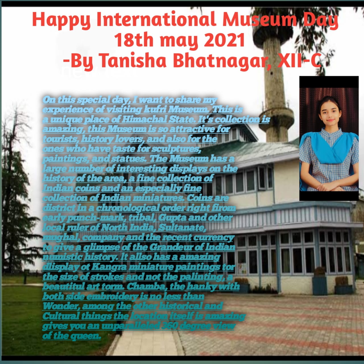 The students of class XII C celebrated International Museum Day 2021. Tanisha Bhatnagar, Suhani Dixit, Mansha Chug and Avni Jyani presented their views on ‘Museums’ as important means of cultural exchange, enrichment of cultures and development of mutual understanding, cooperation and peace among people.